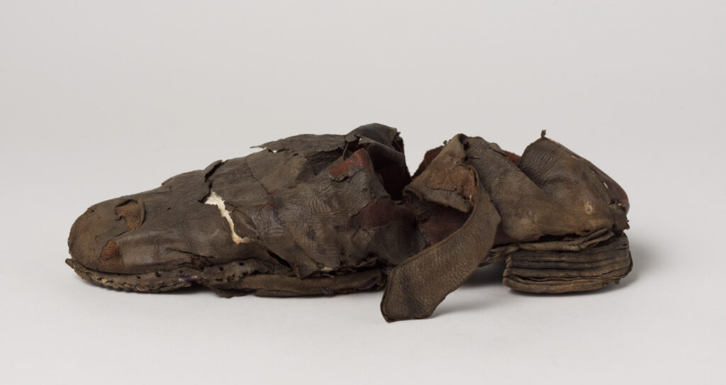 Schoen, mogelijk voor een linkervoet, in het geheel gemaakt van leer. De originele schoen bestaat uit donkerbruin leer en is deels gereconstrueerd uit nieuw roestbruin leer. De schoenzool en hak zijn opgebouwd uit verschillende lagen dun leer en met kleine, tapslopende houten schoenspijkers en dik garen aan elkaar vastgezet. Vondst uit VOC-scheepswrak 't Vliegend Hert, gezonken in 1735. Te zien in de vaste presentatie Ga mee naar zee, ruimte Bepakken en bemannen. Dit object is in 1990 opgedoken; met vondstnummer 90A2333.