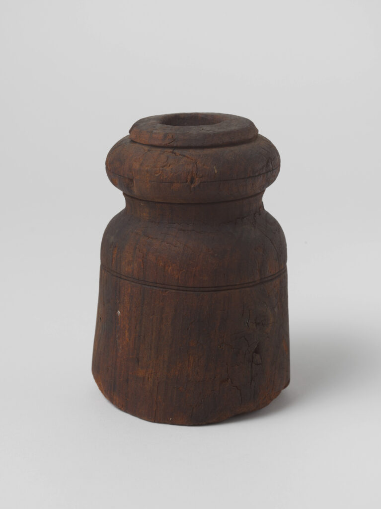 Dit object bestaat uit een loden inktpothouder en een smal cilindervormig kokertje van lood, dat diende als houder voor de schrijfpen of -veer. De inktpot heeft een brede, ronde basis met daar bovenop een zeskantige, conische holle houder met een ronde opening voor een kleinere inktpot voor de vloeibare inkt. Om het omvallen tegen te gaan heeft een inktpot meestal een brede basis en een smalle hals. Vondst uit VOC-scheepswrak 't Vliegend Hert, gezonken in 1735. Collectie RCE. Dit object is in 1984 opgedoken; met vondstnummer 0128 VIII 0002.